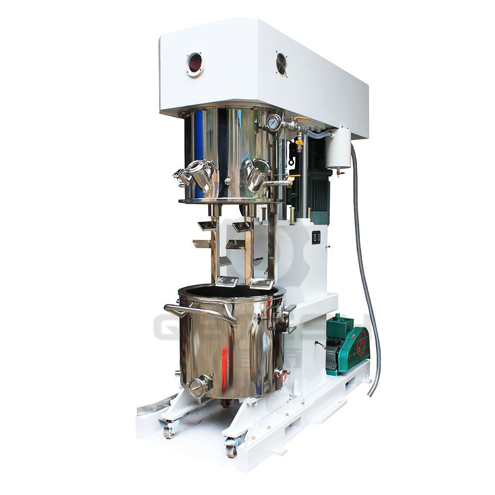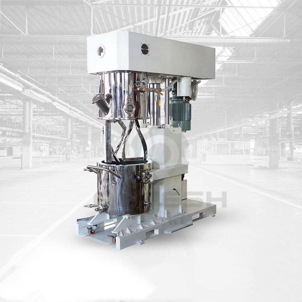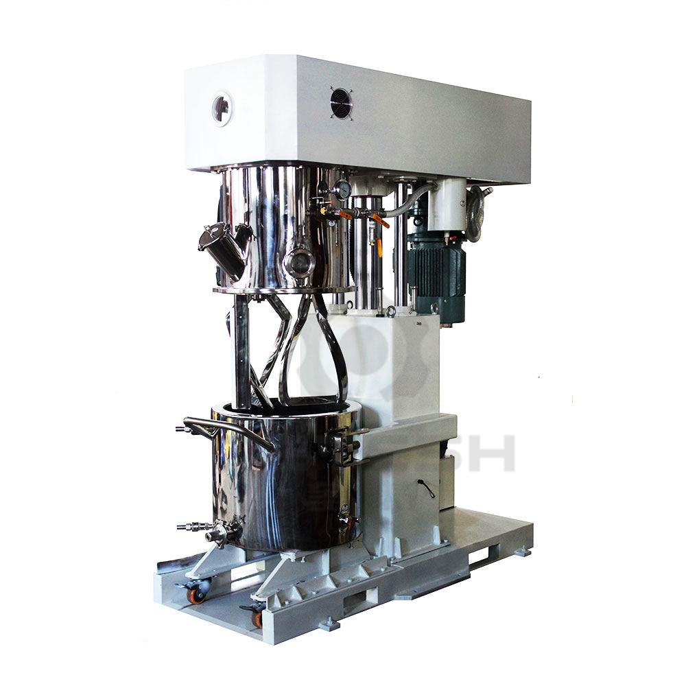 双行星混合机的搅拌桨叶,在公转的同时也自转,使罐体内物料上下及四周循环运动,从而可在很短时间内达到混合(混炼)效果。罐体内壁为大型立车精加工,再经大型抛光机自动抛光,确保行星箱上的活动刮刀在旋转时,把罐体内壁上的物料完全刮掉。该机特别适合从粉体到高黏度、高密度的物料溶解、混合、混炼、反应工艺。广泛应用于电池、有机硅胶、油墨、染料、粘胶剂、高粘度涂料等化工产品。